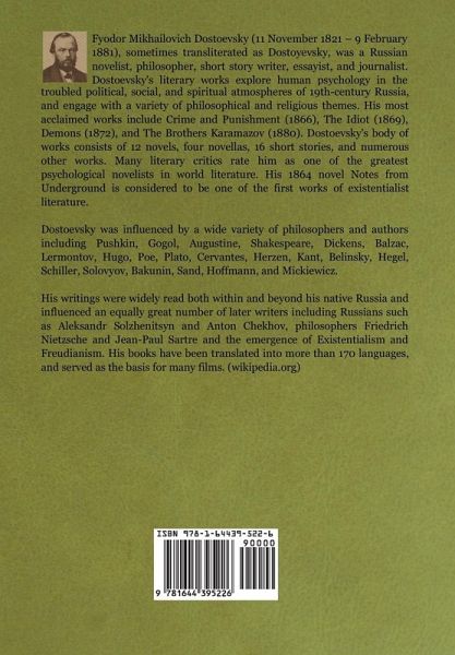 Fyodor Mikhailovich Dostoevsky (11 November 1821 - 9 February 1881), sometimes transliterated as Dostoyevsky, was a Russian novelist, philosopher, short story writer, essayist, and journalist. Dostoevsky's literary works explore human psychology in the troubled political, social, and spiritual atmospheres of 19th-century Russia, and engage with a variety of philosophical and religious themes. His most acclaimed works include Crime and Punishment (1866), The Idiot (1869), Demons (1872), and The Brothers Karamazov (1880). Dostoevsky's body of works consists of 12 novels, four novellas, 16 short stories, and numerous other works. Many literary critics rate him as one of the greatest psychological novelists in world literature. His 1864 novel Notes from Underground is considered to be one of the first works of existentialist literature. Dostoevsky was influenced by a wide variety of philosophers and authors including Pushkin, Gogol, Augustine, Shakespeare, Dickens, Balzac, Lermontov, Hugo, Poe, Plato, Cervantes, Herzen, Kant, Belinsky, Hegel, Schiller, Solovyov, Bakunin, Sand, Hoffmann, and Mickiewicz. His writings were widely read both within and beyond his native Russia and influenced an equally great number of later writers including Russians such as Aleksandr Solzhenitsyn and Anton Chekhov, philosophers Friedrich Nietzsche and Jean-Paul Sartre and the emergence of Existentialism and Freudianism. His books have been translated into more than 170 languages, and served as the basis for many films. (wikipedia.org)