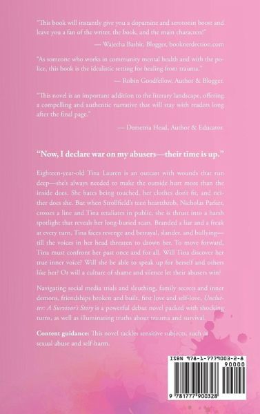 "Now, I declare war on my abusers-their time is up." Eighteen-year-old Tina Lauren is an outcast with wounds that run deep-she's always needed to make the outside hurt more than the inside does. She hates being touched, her clothes don't fit, and neither does she. But when Strollfield's teen heartthrob, Nicholas Parker, crosses a line and Tina retaliates in public, she is thrust into a harsh spotlight that reveals her long-buried scars. Branded a liar and a freak at every turn, Tina faces revenge and betrayal, slander, and bullying-till the voices in her head threaten to drown her. To move forward, Tina must confront her past once and for all. Will Tina discover her true inner voice? Will she be able to speak up for herself and others like her? Or will a culture of shame and silence let their abusers win? Navigating social media trials and sleuthing, family secrets and inner demons, friendships broken and built, first love and self-love, Unclutter: A Survivor's Story is a powerful debut novel packed with shocking turns, as well as illuminating truths about trauma and survival. Content guidance: This novel tackles sensitive subjects, such as sexual abuse and self-harm.