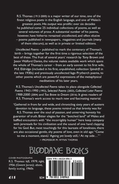 R.S. Thomas (1913-2000) is one of the major poets of our time, as well as one of the finest religious poets in the English language and Wales's greatest poet. He published over 50 books of poetry and prose. Most of his poems from his first 50 years of writing are in Collected Poems 1945-1990 (Phoenix Press), while the poems from his last five collections are included in Collected Later Poems (2004) from Bloodaxe. His Penguin Selected Poems is a curious selection drawing on both his Collecteds. His Uncollected Poems, edited by Tony Brown and Jason Walford Davies (Bloodaxe Books, 2013), selects previously published but uncollected poems included in none of his other published books. Born in Cardiff, the son of a sea captain, he moved with his family in 1918 to Holyhead on Anglesey. He was awarded a bursary in 1932 to study at the University College of North Wales, Bangor, where he read Classics. In 1936, having completed his theological training at St. Michael's College, Llandaff, he was ordained as a priest in the Church in Wales. From 1936 to 1940 he was the curate of Chirk, Denbighshire, where he met his future wife, Mildred (Elsi) Eldridge, an English artist. He subsequently became curate at Tallarn Green, Flintshire. They married in 1940 and remained together until her death in 1991. He married his second wife Betty in 1996. From 1942 to 1954 Thomas was rector at Manafon, in rural Montgomeryshire. It was during his time at Manafon that he first began to study Welsh and that he published his first three volumes of poetry. He learnt the Welsh language at the age of 30, too late in life, he said, to be able to write poetry in it, although he did write and publish memoirs in Welsh. In his later years he worked in predominantly Welsh-speaking communities at Eglwys-fach and Aberdaron. He retired from the Church in 1978, and afterwards lived on Anglesey. He won several awards, including the Queen's Gold Medal for Poetry in 1964. In 1996 he won the Lannan Lifetime Achievement Award for Poetry and the Horst Bienek Prize for Poetry. He was also nominated for the 1996 Nobel Prize in Literature (awarded to Seamus Heaney).