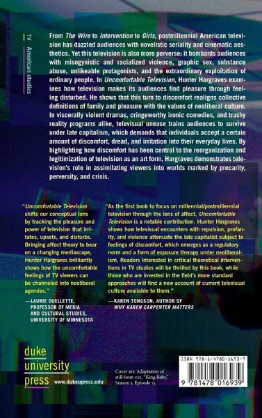 From The Wire to Intervention to Girls, postmillennial American television has dazzled audiences with novelistic seriality and cinematic aesthetics. Yet this television is also more perverse: it bombards audiences with misogynistic and racialized violence, graphic sex, substance abuse, unlikeable protagonists, and the extraordinary exploitation of ordinary people. In Uncomfortable Television, Hunter Hargraves examines how television makes its audiences find pleasure through feeling disturbed. He shows that this turn to discomfort realigns collective definitions of family and pleasure with the values of neoliberal culture. In viscerally violent dramas, cringeworthy ironic comedies, and trashy reality programs alike, televisual unease trains audiences to survive under late capitalism, which demands that individuals accept a certain amount of discomfort, dread, and irritation into their everyday lives. By highlighting how discomfort has been central to the reorganization and legitimization of television as an art form, Hargraves demonstrates television's role in assimilating viewers into worlds marked by precarity, perversity, and crisis.