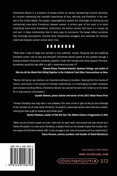 UnCommon Bonds is a collection of essays written by women representing multiple identities; all uniquely addressing the impactful experiences of race, ethnicity, and friendship in the context of the United States. The essays unapologetically explore the challenges of developing and maintaining cross-racial friendships between women. A primary goal of this book is to resist simplifying cross-racial friendships. Instinctively, the editors believe that there is a unique joy and pain in these relationships that is rarely easy to summarize. The essays reflect narratives that challenge assumptions, disclose deep interpersonal struggles, and celebrate the complex sisterhood between women across racial lines.