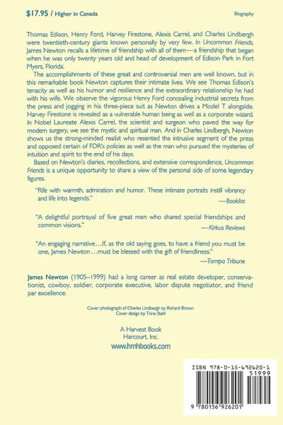 James Newton's Uncommon Friends is "a delightful portrayal of five great men who shared special friendships and common visions" (Booklist).Thomas Edison, Henry Ford, Harvey Firestone, Alexis Carrel, and Charles Lindbergh were twentieth century giants known personally by very few. In this compelling memoir, James Newton recalls a lifetime of friendship with all of them ? a friendship that began when he was only twenty years old and head of development of Edison Park in Fort Meyers, Florida.Based on Newton's diaries, recollections, and extensive correspondence, Uncommon Friends is a unique opportunity to share a view of the personal side of some legendary historical figures.
