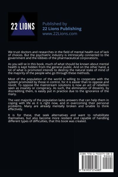 We trust doctors and researches in the field of mental health out of lack of choices. But the psychiatric industry is intrinsically connected to the government and the lobbies of the pharmaceutical corporations. As you will se in this book, much of what should be known about mental health is kept hidden from the general public. And on the other hand, a lot of what is promoted intends to destroy the natural state of mind of the majority of the people who go through these methods. Most of the population of the world is willing to cooperate with the system promoted by those in control, for it is easier than to oppose and revolt. To oppose the mainstream solutions is now an act of rebellion seen as insanity or conspiracy. As such, the elimination of dissents, by discrediting them, is easily put in practice due to the ignorance of the many. The vast majority of the population lacks answers that can help them in coping with life as it is right now, and in overcoming their personal problems. Many are already mentally broken and unable to think effectively. It is for these, that seek alternatives and want to rehabilitate themselves, but also become more resilient and capable of handling different types of difficulties, that this book was created.