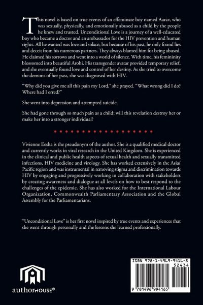 This novel is based on true events of an effeminate boy named Aarav, who was sexually, physically, and emotionally abused as a child by the people he knew and trusted. Unconditional Love is a journey of a well-educated boy who became a doctor and an ambassador for the HIV prevention and human rights. All he wanted was love and solace, but because of his past, he only found lies and deceit from his numerous partners. They always blamed him for being abused. He claimed his sorrows and went into a world of silence. With time, his femininity blossomed into beautiful Arohi. His transgender avatar provided temporary relief, and she eventually found love and control of her destiny. As she tried to overcome the demons of her past, she was diagnosed with HIV. "Why did you give me all this pain my Lord," she prayed. "What wrong did I do? Where had I erred?" She went into depression and attempted suicide. She had gone through so much pain as a child; will this revelation destroy her or make her into a stronger individual?