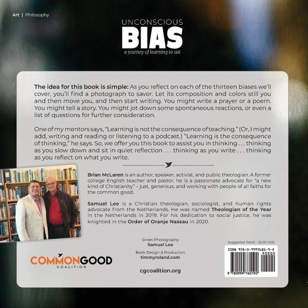 When I began researching the subject of bias, I was simply trying to make sense of some disturbing things I saw happening around me in the political and religious worlds. I had no idea that my research would turn into an extended essay in the form of a short e-book "Why Don't They Get It? Overcoming Bias in Others - and Yourself". Nor did I expect that that extended essay would inspire a podcast, "Learning How to See", co-hosted with my dear friends and colleagues Fr. Richard Rohr & Rev. Dr. Jacqui Lewis. And never in my wildest dreams could I have guessed that Tim Gilman, Creative Director for the Common Good Coalition would invite me to team up with our mutual friend Rev. Dr. Samual Lee, who, in addition to his extraordinary leadership in a congregation and university, is also an artist with a deep love of photography. The idea for this book is simple: As you reflect on each of the thirteen biases we'll cover, you'll find a photograph to savor. Let its composition and colors still you and then move you, and then start writing. You might write a prayer or a poem. You might tell a story. You might jot down some spontaneous reactions, or even a list of questions for further consideration. One of my mentors says, "Learning is not the consequence of teaching." (Or, I might add, writing and reading or listening to a podcast.) "Learning is the consequence of thinking," he says. So, we offer you this book to assist you in thinking . . . thinking as you slow down and sit in quiet reflection . . . thinking as you write . . . thinking as you reflect on what you write. In many ways, biases are shortcuts around thinking. They are ways our brains try to say, "You're busy enough already. No need to think about this." Shortcuts are sometimes helpful, but sometimes, they lead to dangerous dead ends. Thanks for your interest. Thanks for thinking, and learning! One of my mentors says, "Learning is not the consequence of teaching." (Or, I might add, writing and reading or listening to a podcast.) "Learning is the consequence of thinking," he says. So, we offer you this book to assist you in thinking . . . thinking as you slow down and sit in quiet reflection . . . thinking as you write . . . thinking as you reflect on what you write.
