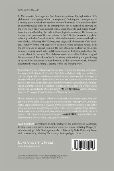 In Unconsolable Contemporary Paul Rabinow continues his explorations of "a philosophic anthropology of the contemporary." Defining the contemporary as a moving ratio in which the modern becomes historical, Rabinow shows how an anthropological ethos of the contemporary can be realized by drawing on the work of art historians, cultural critics, social theorists, and others, thereby inventing a methodology he calls anthropological assemblage. He focuses on the work and persona of German painter Gerhard Richter, demonstrating how reflecting on Richter's work provides rich insights into the practices and stylization of what, following Aby Warburg, one might call "the afterlife of the modern." Rabinow opens with analyses of Richter's recent Birkenau exhibit: both the artwork and its critical framing. He then chronicles Richter's experiments in image-making as well as his subtle inclusion of art historical and critical discourses about the modern. This, Rabinow contends, enables Richter to signal his awareness of the stakes of such theorizing while refusing the positioning of his work by modernist critical theorists. In this innovative work, Rabinow elucidates the ways meaning is created within the contemporary.