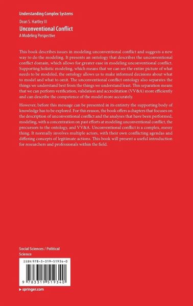 This book describes issues in modeling unconventional conflict and suggests a new way to do the modeling. It presents an ontology that describes the unconventional conflict domain, which allows for greater ease in modeling unconventional conflict. Supporting holistic modeling, which means that we can see the entire picture of what needs to be modeled, the ontology allows us to make informed decisions about what to model and what to omit. The unconventional conflict ontology also separates the things we understand best from the things we understand least. This separation means that we can perform verification, validation and accreditation (VV&A) more efficiently and can describe the competence of the model more accurately.