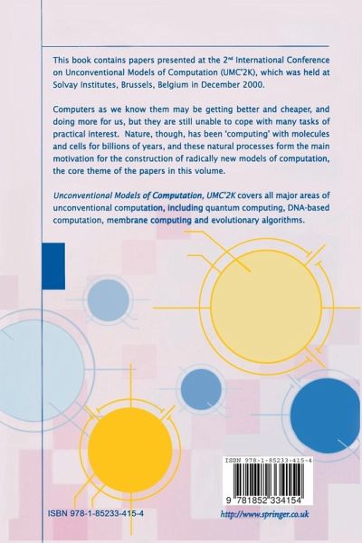The Second International Conference on Unconventional Models of Compu UMC'2K, organized by the Centre for Discrete Mathematics and The tation, oretical Computer Science, the International Solvay Institutes for Physics and Chemistry and the Vrije Universiteit Brussel Theoretical Physics Division was held at Solvay Institutes from 13 to 16 December, 2000. The computers as we know them today, based on silicon chips, are get ting better and better, cheaper and cheaper, and are doing more and more for us. Nonetheless, they still give rise to frustrations because they are unable to cope with many tasks of practical interest: Too many problems are effectively intractable. A simple example: cyber movie networks face the near impossible task of building a brand in a computing and communication almost vacuum. Fortunately, for billions of years nature itself has been "computing" with molecules and cells. These natural processes form the main motivation for the construction of radically new models of computation, the core interest of our conference. The ten invited speakers at the conference were: 1. Accardi (Rome, Italy), S. Bozapalidis (Thessaloniki, Greece), K. Gustafson (Boulder, USA), T. Head (Binghamton, USA), T. Hida (Nagoya, Japan), v. Ivanov (Dubna, Russia), G. Piiun (Bucharest, Romania), G. Rozenberg (Lei den, the Netherlands). H. Siegelmann (Haifa, Israel), and E. Winfree (Caltech, USA). The Programme Committee consisting ofM. Amos (Liverpool, UK), I. An toniou (Co-chair, Brussels, Belgium), S. Bozapalidis (Thessaloniki, Greece), G.