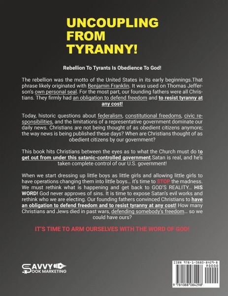 Rebellion To Tyrants Is Obedience To God! The rebellion was the motto of the United States in its early beginnings.That phrase likely originated with Beniamin Franklin. It was used on Thomas Jeffer- son's own personal seal. For the most part, our founding fathers were all Chris- tians. They firmly had an obliqation to defend freedom and to resist tyranny at any cost! Today, historic questions about federalism constitutional freedoms civic responsibilities. and the limitations of a representative government dominate our daily news. Christians are not being thought of as obedient citizens anymore; the way news is being published these days? When are Christians thought of as obedient citizens by our govemment? This book hits Christians between the eyes as to what the Church must do tg get out from under this satanic-controlled qovernment.Satan is real, and he's taken complete control of our U.S. govemment! When we start dressing up little boys as little girls and allowing little girls to have operations changing them into little it's time to STOP the madness. We must rethink what is happening and get back to GOD'S REALITY.¿ HIS WORD! God never approves of sins. It is time to expose Satan's evil works and rethink who we are electing. Our founding fathers convinced Christians to have an obligation to defend freedom and to resist tyranny at any cost! How many Christians and Jews died in past wars. defendinq somebody's freedom... so we could have ours? IT'S TIME TO ARM OURSELVES WITH THE WORD OF GOD!