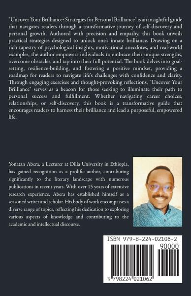 "Uncover Your Brilliance: Strategies for Personal Brilliance" is an insightful guide that navigates readers through a transformative journey of self-discovery and personal growth. Authored with precision and empathy, this book unveils practical strategies designed to unlock one's innate brilliance. Drawing on a rich tapestry of psychological insights, motivational anecdotes, and real-world examples, the author empowers individuals to embrace their unique strengths, overcome obstacles, and tap into their full potential. The book delves into goal-setting, resilience-building, and fostering a positive mindset, providing a roadmap for readers to navigate life's challenges with confidence and clarity. Through engaging exercises and thought-provoking reflections, "Uncover Your Brilliance" serves as a beacon for those seeking to illuminate their path to personal success and fulfillment. Whether navigating career choices, relationships, or self-discovery, this book is a transformative guide that encourages readers to harness their brilliance and lead a purposeful, empowered life.