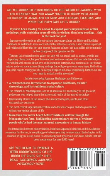 Are you interested in discovering the rich world of Japanese myth and folklore? Have you always wanted to know more about the history of Japan, and the gods and goddesses, creatures, and myths that form part of its culture? If you've been looking for a book to expand your comprehension of this mythology while enriching yourself with its wisdom, then keep reading... this is the book for you! Japanese mythology is an affluent culture that encapsulates the Shinto and Buddhist traditions. In addition to some core beliefs that influence society, it also contains spiritual and religious folklore that not only shapes Japanese culture, but also guides the community on how to approach the dynamics of life. Through this comprehensive guide, not only will you travel back to ancient worlds and legendary characters, but you'll also uncover various creatures that encircle this unique world filled with stories about love, and sometimes betrayals, that remind us of our human nature, and even some extraordinary endings that will give you some more hope. By the time you come back to reality, you will be deeply intrigued but, most importantly, fulfilled. So, are you ready to embark on this adventure? Inside Uncovering Japanese Mythology, you'll discover:A comprehensive introduction to Japanese Buddhism, its brief chronology, and its traditional social culture The creation of Takamagahara, and an all-inclusive list and history of the gods and goddesses who helped shape the history and reality of this sacred mythology Empowering stories of the heroes who interact with gods, spirits, and other extraordinary creatures The most important supernatural creatures who live close to you, and who you interact with across various phases of life More than ten 'never heard before' folktales written through the Monogatari art form, highlighting extraordinary stories of ordinary people who've had the most unusual encounters in human history The interaction between modernization, important Japanese concepts, and the Japanese reverence for the sun, is everything you've been yearning to understand. Each chapter in this book will bring you a step closer to a fascinating and mysterious world and culture that has been in existence for over 2,000 years! Are you ready to embrace a better understanding of life under the rising sun? Then read Uncovering Japanese Mythology now!