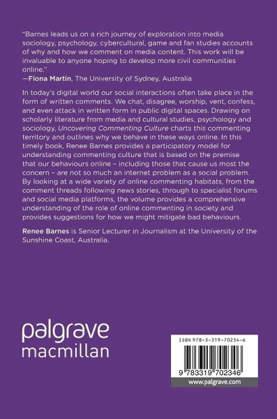 In today's digital world our social interactions often take place in the form of written comments. We chat, disagree, worship, vent, confess, and even attack in written form in public digital spaces. Drawing on scholarly literature from media and cultural studies, psychology and sociology, Uncovering Commenting Culture charts this commenting territory and outlines why we behave in these ways online. In this timely book, Renee Barnes provides a participatory model for understanding commenting culture that is based on the premise that our behaviours online-including those that cause us most the concern-are not so much an internet problem as a social problem. By looking at a wide variety of online commenting habitats, from the comment threads following news stories, through to specialist forums and social media platforms, the volume provides a comprehensive understanding of the role of online commenting in society and provides suggestions for how we might mitigate bad behaviours.