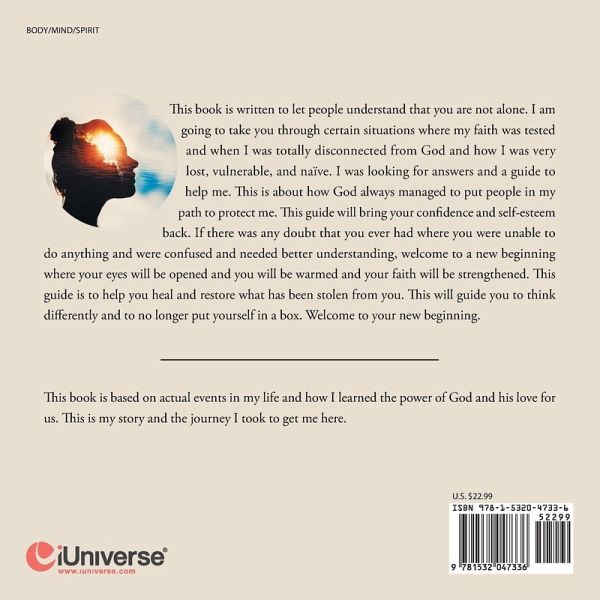 This book is written to let people understand that you are not alone. I am going to take you through certain situations where my faith was tested and when I was totally disconnected from God and how I was very lost, vulnerable, and nave. I was looking for answers and a guide to help me. This is about how God always managed to put people in my path to protect me. This guide will bring your confidence and self-esteem back. If there was any doubt that you ever had where you were unable to do anything and were confused and needed better understanding, welcome to a new beginning where your eyes will be opened and you will be warmed and your faith will be strengthened. This guide is to help you heal and restore what has been stolen from you. This will guide you to think differently and to no longer put yourself in a box. Welcome to your new beginning.