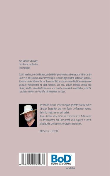 Axel Michael SallowskyUnd alles ist nur Illusion...Zwei NovellenErzählt werden zwei Geschichten, die Einblicke gewähren in das Denken, in das Fühlen, in die Träume, in die Illusionen, in die Lebensängste, in das mutige Handeln und in das grandiose Scheitern zweier Männer, die auf den ersten Blick in absolut unterschiedlichen Welten und abstrusen Wirklichkeiten zu leben scheinen. Der eine, genialer Erfinder, Visionär und Utopist, möchte seinen Kindheits-Traum von einer besseren Welt verwirklichen, nicht für sich allein, sondern zum Wohl für alle Menschen auf Erden. Der andere, ein von seinen Jüngern geliebter, hochsensibler Künstler, Esoteriker und von Tragik umflatterter Narziss, dreht sich stets nur um sich selbst. Beide standen viele Jahre als charismatische Außenseiter an der Peripherie der Gesellschaft und zugleich in deren Mittelpunkt. Und dennoch müssen sie scheitern.206 Seiten, EUR 8,99