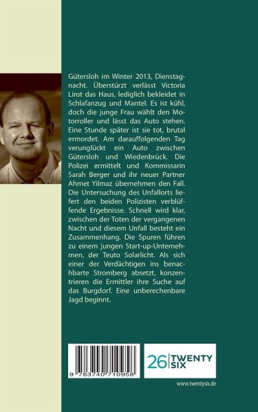 Gütersloh im Winter 2013, Dienstagnacht. Überstürzt verlässt Victoria Lirot das Haus, lediglich bekleidet in Schlafanzug und Mantel. Es ist kühl, doch die junge Frau wählt den Motorroller und lässt das Auto stehen. Eine Stunde später ist sie tot, brutal ermordet. Wovor ist Frau Lirot geflüchtet oder was hatte sie vor? Am darauffolgenden Tag verunglückt ein Auto zwischen Gütersloh und Wiedenbrück. Die Kreispolizeibehörde ermittelt und Kommissarin Sarah Berger und ihr neuer Partner Ahmet Yilmaz übernehmen den Fall. Die Untersuchung des Unfallorts liefert den beiden Polizisten verblüffende Ergebnisse. Schnell wird klar, zwischen der Toten der vergangenen Nacht und diesem Unfall besteht ein Zusammenhang. Die Spuren führen zu einem jungen Start-up-Unternehmen, der Teuto Solarlicht. Undurchsichtig erscheint das Treiben ihrer Gesellschafter, folgenreich das, was sie tun. Als sich einer der Verdächtigen ins benachbarte Stromberg absetzt, konzentrieren die Ermittler ihre Suche auf das Burgdorf. Eine unberechenbare Jagd beginnt.