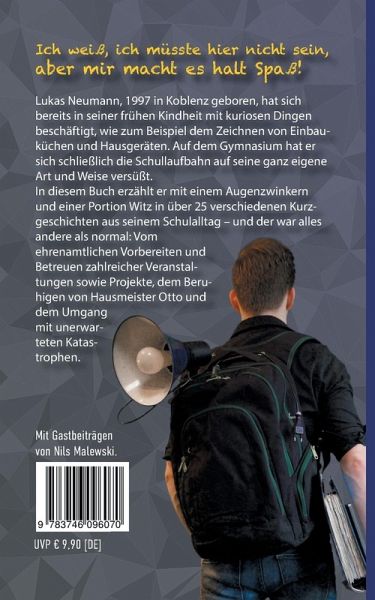 Kennen Sie jemanden, der freiwillig etwa 1000 Überstunden an seiner Schule abgeleistet hat? Nein? Dann wird es Zeit!Lukas Neumann, 1997 in Koblenz geboren, hat sich bereits in seiner frühen Kindheit mit kuriosen Dingen beschäftigt, wie zum Beispiel dem Zeichnen von Einbauküchen und Hausgeräten. Auf dem Gymnasium hat er sich schließlich die Schullaufbahn auf seine ganz eigene Art und Weise versüßt: Unter anderem war er Gründungsmitglied eines Technik-Teams an der Schule und arbeitete in zahlreichen Projektgruppen mit.In seinem Buch erzählt mit einem Augenzwinkern und einer Portion Witz in über 25 verschiedenen Kurzgeschichten aus seinem Schulalltag - und der war alles andere als normal: Vom ehrenamtlichen Vorbereiten und Betreuen der zahlreichen Veranstaltungen und Projekte, dem Beruhigen von Hausmeister Otto und dem Umgang mit unerwarteten Katastrophen.