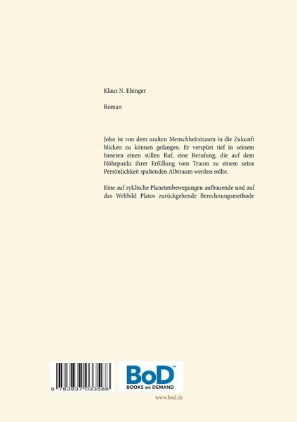 Klaus N. EhingerRomanJohn ist von dem uralten Menschheitstraum, in die Zukunft blicken zu können, gefangen. Er verspürt tief in seinem Inneren einen stillen Ruf, eine Berufung, die auf dem Höhepunkt ihrer Erfüllung vom Traum zu einem seine Persönlichkeit spaltenden Albtraum werden sollte. Eine auf zyklische Planetenbewegungen aufbauende und auf das Weltbild Platos zurückgehende Berechnungsmethode würde den von der Menschheit ewig verfolgten Traum, die Zukunft berechnen und vorhersehen zu können, in fantastischer, aber auch zutiefst erschreckender Art und Weise erfüllen, denn John muss…mehr