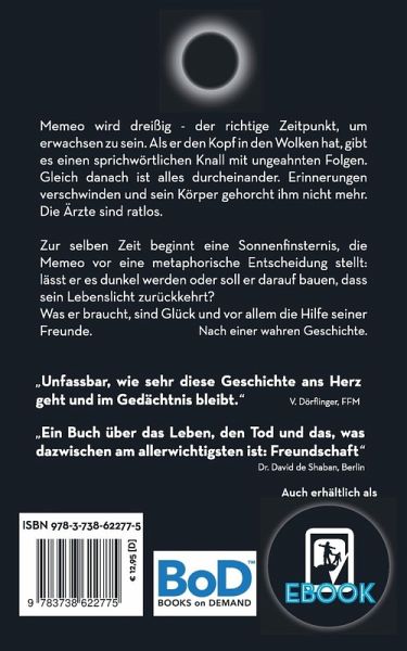 Memeo wird dreißig - der richtige Zeitpunkt, um erwachsen zu sein. Als er den Kopf in den Wolken hat, gibt es einen sprichwörtlichen Knall mit ungeahnten Folgen. Gleich danach ist alles durcheinander. Erinnerungen verschwinden und sein Körper gehorcht ihm nicht mehr. Die Ärzte sind ratlos. Zur selben Zeit beginnt eine Sonnenfinsternis, die Memeo vor eine metaphorische Entscheidung stellt: lässt er es dunkel werden oder soll er darauf bauen, dass sein Lebenslicht zurückkehrt?Was er braucht, sind Glück und vor allem die Hilfe seiner Freunde.Nach einer wahren Geschichte.