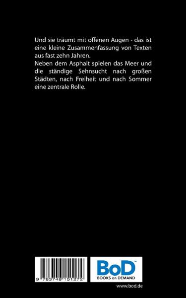 Und sie träumt mit offenen Augen - das ist eine kleine Zusammenfassung von Texten aus fast zehn Jahren. Neben dem Asphalt spielen das Meer und die ständige Sehnsucht nach großen Städten, nach Freiheit und nach Sommer eine zentrale Rolle.
