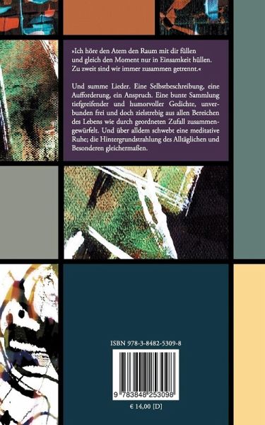 »Ich höre den Atem den Raum mit dir füllen und gleich den Moment nur in Einsamkeit hüllen. Zu zweit sind wir immer zusammen getrennt.«Und summe Lieder. Eine Selbstbeschreibung, eine Aufforderung, ein Anspruch. Eine bunte Sammlung von tiefgreifenden und humorvollen Gedichten, unverbunden frei und doch zielstrebig aus allen Bereichen des Lebens wie durch geordneten Zufall zusammengewürfelt. Und über alldem schwebt eine meditative Ruhe; die Hintergrundstrahlung des Alltäglichen und Besonderen gleichermaßen.