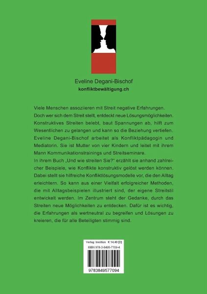 Eveline Degani-Bischof arbeitet als Konfliktpädagogin und Mediatorin. Sie ist Mutter von vier Kindern und leitet mit ihrem Mann Kommunikationstrainings und Streitseminare. In ihrem Buch Und wie streiten Sie? erzählt sie anhand zahlreicher Beispiele, wie Konflikte konstruktiv gelöst werden können. Dabei stellt sie hilfreiche Konfliktlösungsmodelle vor, die den Alltag erleichtern. So kann aus einer Vielfalt erfolgreicher Methoden, die mit Alltagsbeispielen illustriert sind, der eigene Streitstil entwickelt werden. Im Zentrum steht der Gedanke, durch das Streiten neue Möglichkeiten zu entdecken. Dafür ist es wichtig, die Erfahrungen als wertneutral zu begreifen und Lösungen zu kreieren, die für alle Beteiligten stimmig sind.
