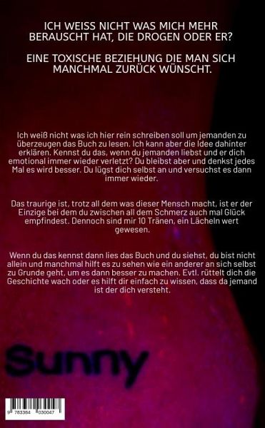 In diesem Buch geht es um eine Toxische Beziehung, Drogen, Sex, Partys, Liebe ,Frust und Leidenschaft. Wie ein Mensch, mit dem man nicht gerechnet hat, dein Leben verändert und dich selbst. Man Seiten an sich entdeckt die man gar nicht kannte. Jeder der schon mal blind geliebt hat wird es verstehen. Jeder Anständige und rational denkende Mensch der Moral hat, sollte es sich zweimal überlegen. Das Buch führt vor Augen wie wir Dinge tun und erst im Nachgang realisieren, was wir getan haben.