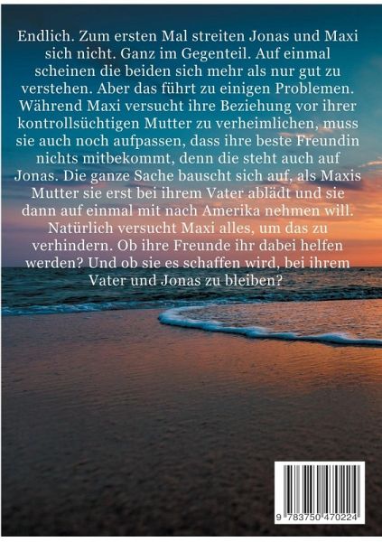 Endlich. Zum ersten Mal streiten Jonas und Maxi sich nicht. Ganz im Gegenteil. Auf einmal scheinen die beiden sich mehr als nur gut zu verstehen. Aber das führt zu einigen Problemen. Während Maxi versucht ihre Beziehung vor ihrer kontrollsüchtigen Mutter zu verheimlichen, muss sie auch noch aufpassen, dass ihre beste Freundin nichts mitbekommt, denn die steht auch auf Jonas. Die ganze Sache bauscht sich auf, als Maxis Mutter sie erst bei ihrem Vater ablädt und sie dann auf einmal mit nach Amerika nehmen will. Natürlich versucht Maxi alles, um das zu verhindern. Ob ihre Freunde ihr dabei helfen werden? Und ob sie es schaffen wird bei ihrem Vater zu und Jonas zu bleiben?