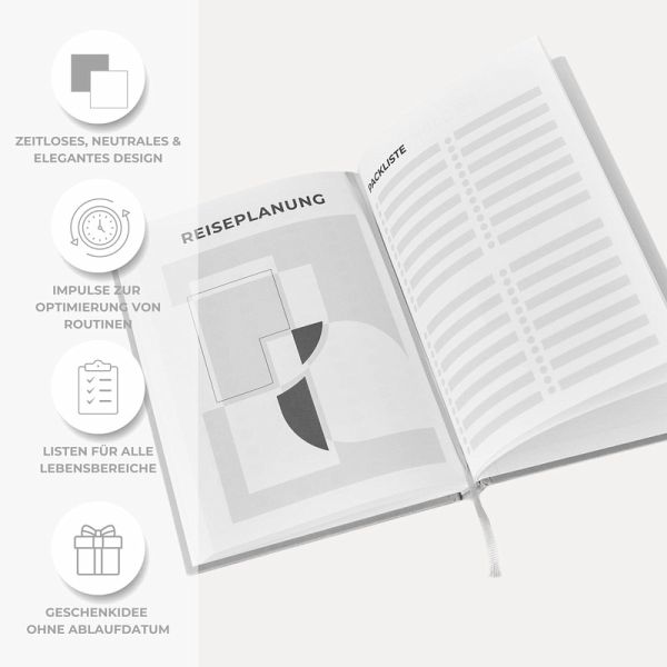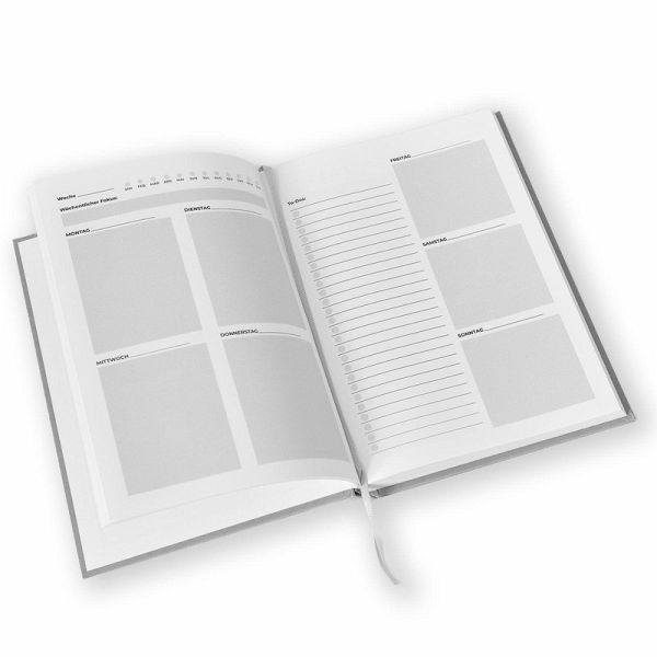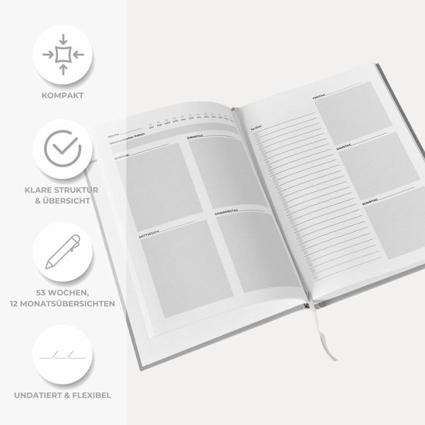 Das Designist bewusst schlicht und zeitlos gewählt: graues, strukturiertes Hardcover, elegant und neutral. Ein Planer, der zu jedem passt - ob im Job, im Studium oder im Alltag.