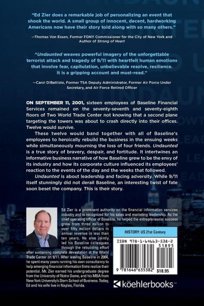 On September 11, 2001, sixteen employees of Baseline Financial Services remained on the seventy-seventh and seventy-eighth floors of Two World Trade Center not knowing that a second plane targeting the towers was about to crash directly into their offices. Twelve would survive. These twelve would band together with all of Baseline's employees to heroically rebuild the business in the ensuing weeks while simultaneously mourning the loss of four friends. Undaunted is a true story of bravery, despair, and fortitude. It intertwines an informative business narrative of how Baseline grew to be the envy of its industry and how its corporate culture influenced its employees' reaction to the events of the day and the weeks that followed. Undaunted is about leadership and facing adversity. While 9/11 itself stunningly did not derail Baseline, an interesting twist of fate soon beset the company. This is their story.