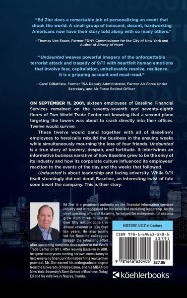 On September 11, 2001, sixteen employees of Baseline Financial Services remained on the seventy-seventh and seventy-eighth floors of Two World Trade Center not knowing that a second plane targeting the towers was about to crash directly into their offices. Twelve would survive. These twelve would band together with all of Baseline's employees to heroically rebuild the business in the ensuing weeks while simultaneously mourning the loss of four friends. Undaunted is a true story of bravery, despair, and fortitude. It intertwines an informative business narrative of how Baseline grew to be the envy of its industry and how its corporate culture influenced its employees' reaction to the events of the day and the weeks that followed. Undaunted is about leadership and facing adversity. While 9/11 itself stunningly did not derail Baseline, an interesting twist of fate soon beset the company. This is their story.