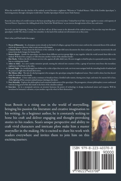 Welcome to the world of "Undead Menace: Tales of the Zombie Apocalypse", an anthology that drags you into the harrowing world of the undead. This collection of post-apocalyptic horror stories will chill your spine and quicken your pulse. Each tale explores humanity's greatest fears and the macabre reality of survival in a dystopian world overrun by the undead. These gripping narratives tell stories of love, loss, terror, and survival, as each character fights to keep hope alive in their grim reality. Immerse yourself in tales that stretch across the genre spectrum, bridging 'Zombie Apocalypse Fiction' with 'Dark Fantasy', resulting in a unique blend of horror that will haunt your dreams. From the first hints of the apocalypse to the aftermath of the undead menace, each story weaves a rich, terrifying tapestry of horror and suspense. If you're a fan of 'Survival Horror Novellas' or 'End of the World Horror', you'll find yourself engrossed in this chilling anthology. It offers a fresh, horrific perspective on 'Post-Apocalyptic Horror Stories', perfect for fans of dystopian thrillers and dark fantasy. These 'Undead Survival Tales' are not for the faint-hearted, but for those who crave the thrill of horror, suspense, and the ever-looming threat of the undead. "Undead Menace: Tales of the Zombie Apocalypse" – dare to read it, and you'll never see the world in the same light again. Enter the post-apocalyptic world of the undead, where danger lurks around every corner, and only the strongest survive. Get your copy now and join the fight for survival against the undead menace.