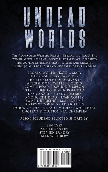 The Dead Have Risen! Get ready to Run! Hide! and Fight! The Reanimated Writers are back with their flagship anthology, Undead Worlds! This time we have 16 brand new stories from today's best in zombie fiction for you to dig your teeth into! Check out these gruesome and action-packed stories inside Undead Worlds 3! BROKEN WORLD - KATE L. MARY THE FLASH - JESSICA GOMEZ THE ZEE BROTHERS - GRIVANTE AFTERSHOCK - VALERIE LIOUDIS ZOMBIE ROAD - DAVID A. SIMPSON CITY OF DEVILS - JUSTIN ROBINSON DEAD AWARE - ELEANOR MERRY AMONG THE DEAD - RYAN COLLEY ZOMBIE UPRISING - M.A. ROBBINS BIKERS VS ZOMBIES - TD RICKETTS LEGION OF THE UNDEAD - MICHAEL WHITEHEAD UNCLEAN EVOLUTION - LC CHAMPLIN ALSO INCLUDING SELECTED SHORTS BY JEN TYES SKYLER RANKIN STEPHEN LANDRY KIRK WITHROW