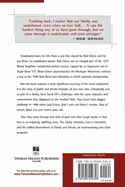 Both Bob and Brian Griese have led their teams through an undefeated season. But this biography explores a more significant meaning to living in victory. Both father and son have emerged bruised and battered but undefeated from some of life's toughest battles. In 1988, Bob Griese lost his wife and Brian lost his mother, Judi, after a five-year battle with cancer. When Bob made a decision to be a full-time dad to 12-year-old Brian, their shared grief, values, and commitment became the cornerstone of a very special father-son bond. Undefeated has all the makings of a dramatic, inspirational sports bestseller in the tradition of Dave Dravecky's Comeback.