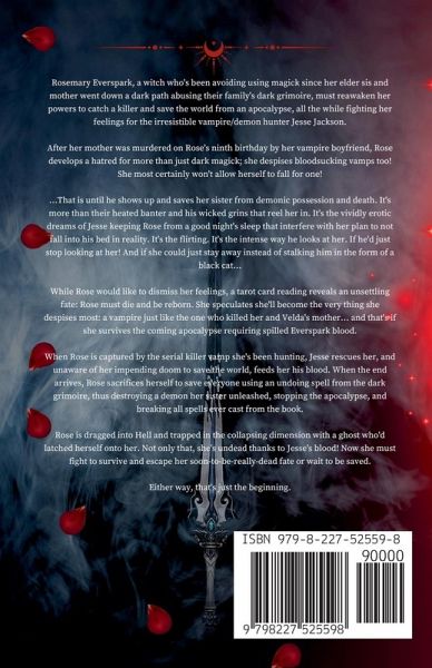 Rosemary Everspark, a witch who's been avoiding using magick since her elder sis and mother went down a dangerous path abusing their family's dark grimoire, must reawaken her powers to catch a killer and save the world from an apocalypse, all the while fighting her feelings for irresistible vampire/demon hunter Jesse Jackson. After her mother was murdered on Rose's ninth birthday by her vampire boyfriend, Rose develops a hatred for more than just dark magick; she despises bloodsucking vamps too! She most certainly won't allow herself to fall for one! ...That is until he shows up and saves her sister from demonic possession and death. It's more than their heated banter and his wicked grins that reel her in. It's the vividly erotic dreams of Jesse keeping Rose from a good night's sleep that interfere with her plan to not fall into his bed in reality. It's the flirting. It's the intense way he looks at her. If he'd just stop looking at her! And if she could just stay away instead of stalking him in the form of a black cat... While Rose would like to dismiss her feelings, a tarot card reading reveals an unsettling fate: Rose must die and be reborn. She speculates she'll become the very thing she despises most: a vampire just like the one who killed her and Velda's mother... and that's if she survives the coming apocalypse requiring spilled Everspark blood. When Rose is captured by the serial killer vamp she's been hunting, Jesse rescues her, and unaware of her impending doom to save the world, feeds her his blood. When the end arrives, Rose sacrifices herself to save everyone using an undoing spell from the dark grimoire, thus destroying a demon her sister unleashed, stopping the apocalypse, and breaking all spells ever cast from the book. Rose is dragged into Hell and trapped in the collapsing dimension with a ghost who'd latched herself onto her. Not only that, she's undead thanks to Jesse's blood! Now she must fight to survive and escape her soon-to-be-really-dead fate or wait to be saved. Either way, that's just the beginning.