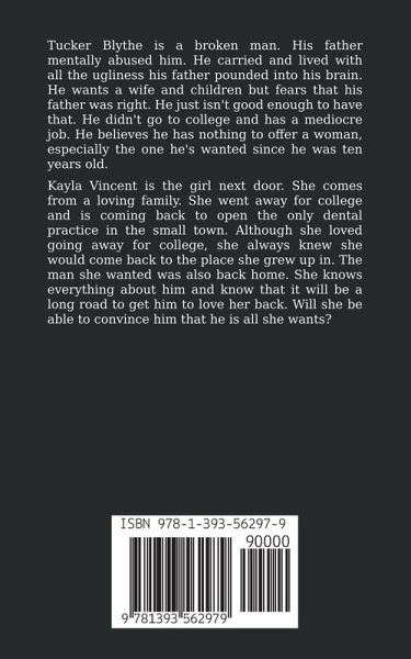 Tucker Blythe is a broken man. His father mentally abused him. He carried and lived with all the ugliness his father has pounded into his brain. He wants a wife and children but fears that his father has been right. He just isn't good enough to have that. He didn't go to college and feels like he is in a mediocre job. He believes he has nothing to offer a woman, especially the one he has wanted since he was ten years old. Kayla Vincent is the girl next door. She comes from a loving family. She went away to college and is coming back to open the only dental practice in the small town. Although she loved going away for college, she always knew that she would come back to the place she grew up in. The man she wanted was also back home. She knows everything about him and knows that it will be a long road to get him to love her back. Will she be able to convince him that he is all she wants?