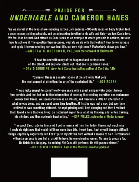 "You become the best you can be by learning from others. That is how bowhunter and ultramarathoner Cameron Hanes approaches each day in his pursuit of greatness in this essential guide to finding success. "I like people who put themselves in a position to become undeniable at what they do. You might not like me, but you cannot deny the work I put in and the results to show for it. You can say whatever the f**k you want, but I want to be undeniable and how it makes you feel is no factor." Endure, Cameron Hanes' New York Times bestselling book, demonstrated how to push beyond your physical limits to improve yourself. In Undeniable, Hanes brings together outliers of today-men and women who are experts in their field-to share their unique and motivating perspectives on reaching the pinnacle of success and remaining there. From popular neuroscientist Andrew Huberman to ultramarathon runner Courtney Dauwalter, you will hear how undeniable individuals have obtained their winning mindset. Many books show how to pursue a dream and successfully make it happen, but few spotlight what to do when you've reached the pinnacle. After fighting so hard and reaching your goals, how do you stay on top? In his pursuit for greatness, Cam has trained with and interviewed track athletes, MMA fighters, NFL Super Bowl champions and experts in other disciplines. All of them legends who have earned their names. What makes them tick? How do they remain undeniable? In Undeniable, Cam reveals the lessons he has learned from truly exceptional people. By examining their unique traits and abilities, you will earn an edge from these greats and add tools on your own journey toward greatness"-- Provided by publisher.