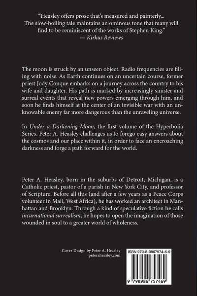 The moon is struck by an unseen object. Radio frequencies are filling with noise. As Earth continues on an uncertain course, former priest Jody Conque embarks on a journey across the country to his wife and daughter. His path is marked by increasingly sinister and surreal events that reveal new powers emerging through him, and soon he finds himself at the center of an invisible war with an unknowable enemy far more dangerous than the unraveling universe. In Under a Darkening Moon, the first volume of the Hyperbolia Series, Peter A. Heasley challenges us to forego easy answers about the cosmos and our place within it, in order to face an encroaching darkness and forge a path forward for the world.