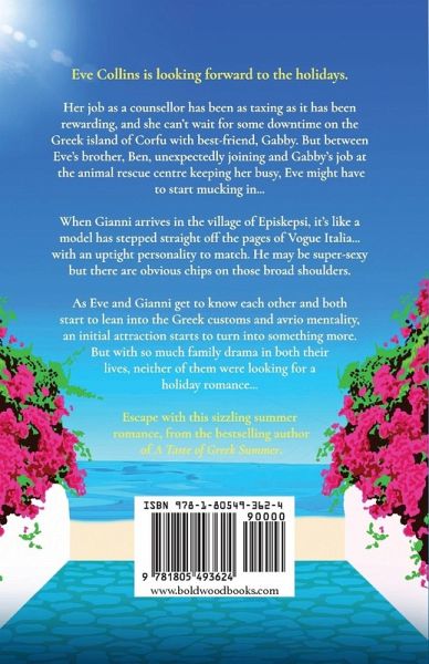 Eve Collins is looking forward to the holidays. Her job as a counsellor has been as taxing as it has been rewarding, and she can't wait for some downtime on the Greek island of Corfu with best-friend, Gabby. But between Eve's brother, Ben, unexpectedly joining and Gabby's job at the animal rescue centre keeping her busy, Eve might have to start mucking in... When Gianni arrives in the village of Episkepsi, it's like a model has stepped straight off the pages of Vogue Italia... with an uptight personality to match. He may be super-sexy but there are obvious chips on those broad shoulders. As Eve and Gianni get to know each other and both start to lean into the Greek customs and avrio mentality, an initial attraction starts to turn into something more. But with so much family drama in both their lives, neither of them were looking for a holiday romance... Escape with this sizzling summer romance, from the bestselling author of A Taste of Greek Summer