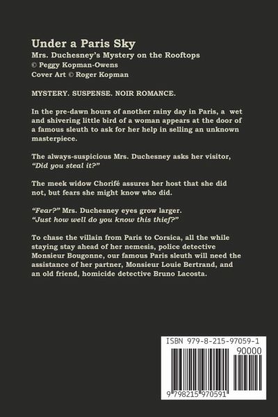Cover Art © Roger Kopman. In the pre-dawn hours of another rainy day in Paris, a wet and shivering little bird of a woman appears at the door of a famous Paris sleuth to ask for help in selling an unknown masterpiece. The always-suspicious Mrs. Duchesney asks her visitor, "Did you steal it?" The meek widow Chorifé assures her host that she did not, but fears she might know who did. "Fear?" Mrs. Duchesney eyes grow larger. "Just how well do you know this thief?" To chase the villain from Paris to Corsica, all the while staying stay ahead of her nemesis, police detective Monsieur Bougonne, Mrs. Duchesney will need the assistance of her sleuthing partner, Monsieur Louie Bertrand, and an old friend, homicide detective Bruno Lacosta.