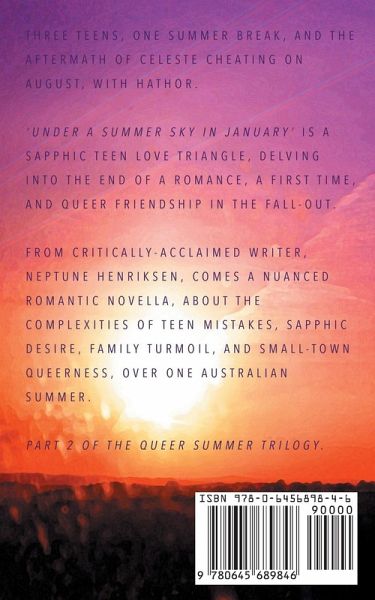 Three teens, one summer break, and the aftermath of Celeste cheating on August, with Hathor. 'Under A Summer Sky In January' is a sapphic teen love triangle, delving into the end of a romance, a first time, and queer friendship in the fall-out. From critically-acclaimed writer, Neptune Henriksen, comes a nuanced romantic novella, about the complexities of teen mistakes, sapphic desire, family turmoil, and small-town queerness, over one Australian summer. Part 2 of the Queer Summer Trilogy.