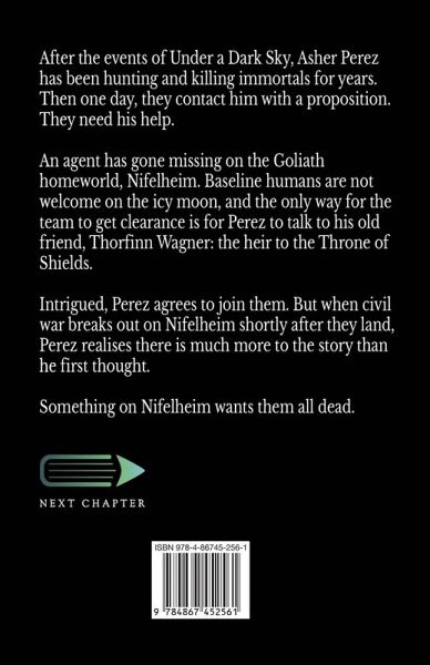After the events of Under a Dark Sky, Asher Perez has been hunting and killing immortals for years. Then one day, they contact him with a proposition. They need his help. An agent has gone missing on the Goliath homeworld, Nifelheim. Baseline humans are not welcome on the icy moon, and the only way for the team to get clearance is for Perez to talk to his old friend, Thorfinn Wagner: the heir to the Throne of Shields. Intrigued, Perez agrees to join them. But when civil war breaks out on Nifelheim shortly after they land, Perez realises there is much more to the story than he first thought. Something on Nifelheim wants them all dead.