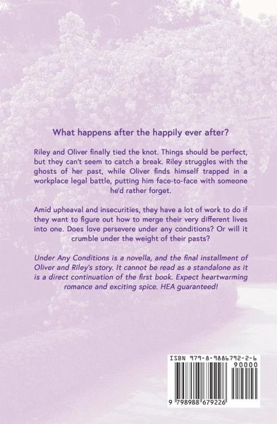 From the author of Contractual Obligations comes the long-awaited sequel to Failure to Thrive! What happens after the happily ever after? Riley and Oliver are finally together. Things should be perfect, but Riley struggles with the ghosts of her past while Oliver finds himself trapped in a workplace legal battle, which puts him face-to-face with someone he'd rather forget. While Riley wonders if she isn't good enough, Oliver knows she's the one for him, but they have a lot of work to do if they want to figure out how to merge their very different lives into one. Does love persevere under any conditions? Or will it crumble under the weight of someone's past? Under Any Conditions is a novella and the final part of Oliver and Riley's story. It cannot be read as a standalone as it is a direct continuation of the first book. Expect heartwarming romance and exciting spice in line with the special edition of this series. HEA guaranteed!