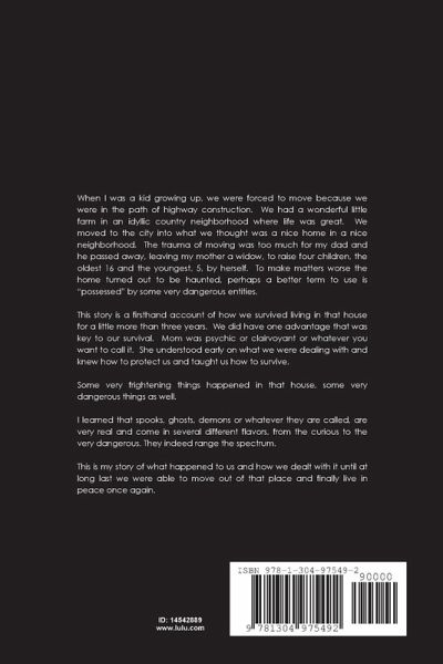 My recently widowed mother of four was financially trapped in a dangerously haunted house. When Dad died, she used the last of our money to purchase a home, not knowing it had been cursed by the former residents. Mom should have known something was wrong. She was a psychic. But distracted by the death of my father and being suddenly thrown into single motherhood, she just didn?t notice what was in the house until we?d already moved in. By then it was too late to do anything but hunker down and survive. This is my firsthand account of living and surviving in that place when I was a young boy. We did battle with demons in that house, both physically and mentally. Mother instructed us and stood guard many a night, not letting them pass?.. to get to us, her sleeping children. But there were a few times they did get past her. Those are the nightmares I still have today, more than fifty years later.