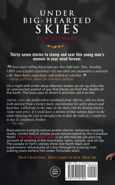 Under Big-Hearted Skies is an affectionate yet piercing account of working on the prairies, mountains, lakes, and oceans. Stories of adventure and conflict and comedy, with crashing float planes in isolated forests, oil-rigs spewing in the night-shift North, fist fights both won and lost, hearts both swelled and broken--but it's the underlying hope, humanity, and love that make this book rare and these stories worth telling. The people on its pages shine like North Stars and supermoons and there's honesty and optimism that moves from side-splitting to heart-aching. Simply put, this book is memorable and worthy of being read: adventures of a young man putting years behind him under fortunate skies.