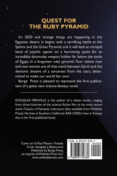 QUEST FOR THE RUBY PYRAMID It's 2020 and strange things are happening in the Egyptian desert. It begins with a terrifying battle at the Sphinx and the Great Pyramid, and it will lead an intrepid band of psychic agents on a harrowing quest for an incredible doomsday weapon hidden far below the sands of Egypt, in a forgotten ruby pyramid. Four valiant men and two women are all that stand between Earth and the demonic dreams of a sorceress from the stars, determined to make our world her own. Borgo Press is pleased to represent the first publication of a great new science-fantasy novel.
