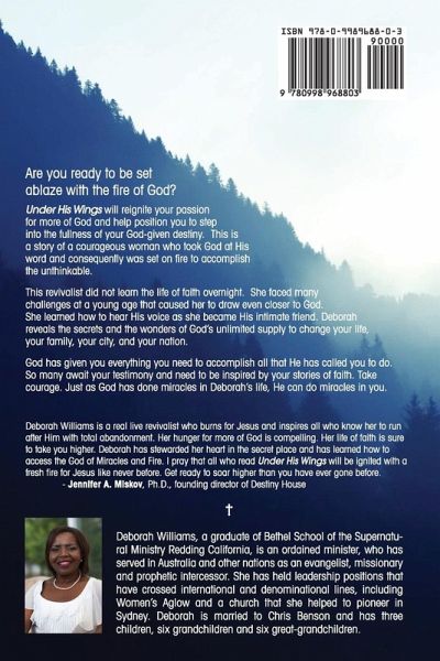 Are you ready to be set ablaze with the fire of God? Under His Wings will reignite your passion for more of God and help position you to step into the fullness of your God-given destiny. This is a story of a courageous woman who took God at His word and consequently was set on fire to accomplish the unthinkable. This revivalist did not learn the life of faith overnight. She faced many challenges at a young age that caused her to draw even closer to God. She learned how to hear His voice, as she became His intimate friend. Deborah reveals the secrets and the wonders of God’s unlimited supply to change your life, your family, your city, and your nation. God has given you everything you need to accomplish all that He has called you to do. So many await your testimony and need to be inspired by your stories of faith. Take courage. Just as God has done miracles in Deborah’s life, He can do miracles in you. Deborah Williams is a real live revivalist who burns for Jesus and inspires all who know her to run after Him with total abandonment. Her hunger for more of God is compelling. Her life of faith is sure to take you higher. Deborah has stewarded her heart in the secret place and has learned how to access to God of Miracles and Fire. I pray that all who read Under His Wings will be ignited with a fresh fire for Jesus like never before. Get ready to soar higher than you have ever gone before. - Jennifer A. Miskov, Ph.D., founding director of Destiny House