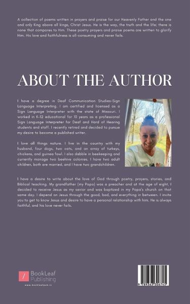 I have a degree in Deaf Communication Studies-Sign Language Interpreting. I am certified and licensed as a Sign Language Interpreter with the state of Missouri. I worked in K-12 educational for 10 years as a professional Sign Language Interpreter for Deaf and Hard of Hearing students and staff. I recently retired and decided to pursue my desire to become a published writer. I love all things nature. I live in the country with my husband, four dogs, two cats, and an array of turkeys, chickens, and guinea fowl. I also dabble in beekeeping and currently manage two beehive colonies. I have two adult children, both are married, and I have two grandchildren. I have a desire to write about the love of God through poetry, prayers, stories, and Biblical teaching. My grandfather (my Papa) was a preacher and at the age of eight, I decided to receive Jesus as my savior and was baptized in my Papa's church on that same day. I depend on Jesus through the good, bad, and everything in between. I invite you to get to know Jesus and desire to have a personal relationship with him. He is always faithful, and his love never fails.