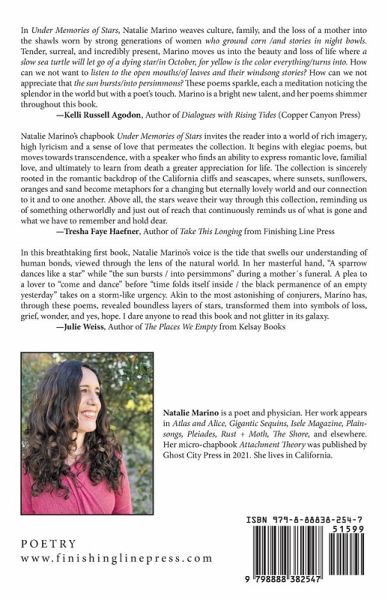 Natalie Marino's chapbook Under Memories of Stars is a collection of lyric poems that use the symbolism of stars to represent what is unreachable but ever present. Involving California's natural landscape, these poems speak about grief and love, the evolution of memory, and the transience of experience.