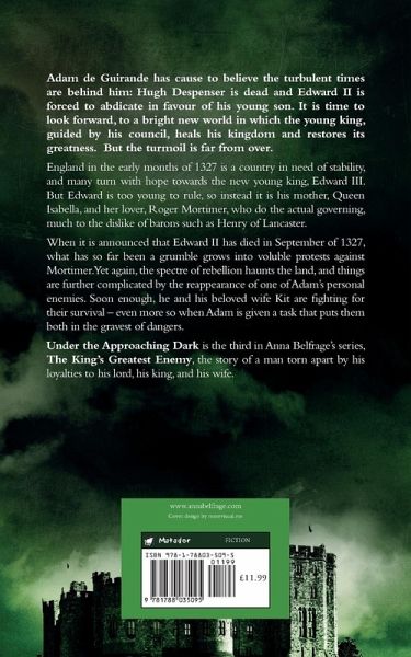 Adam de Guirande has cause to believe the turbulent times are behind him: Hugh Despenser is dead and Edward II has been forced to abdicate in favour of his young son. It is time to look forward, to a bright new world in which the young king, guided by his council, heals his kingdom and restores its greatness. But the turmoil is far from over… After years of strife, England in the early months of 1327 is a country in need of stability, and many turn with hope towards the new young king, Edward III. But Edward is too young to rule, so instead it is his mother, Queen Isabella, and her lover, Roger Mortimer, who do the actual governing, much to the dislike of barons such as Henry of Lancaster. In the north, the Scots take advantage of the weakened state of the realm and raid with impunity. Closer to court, it is Mortimer's increasing powers that cause concerns - both among his enemies, but also for men like Adam, who loves Mortimer dearly, but loves the young king just as much. When it is announced that Edward II has died in September of 1327, what has so far been a grumble grows into voluble protests against Mortimer. Yet again, the spectre of rebellion haunts the land, and things are further complicated by the reappearance of one of Adam's personal enemies. Soon enough, he and his beloved wife Kit are fighting for their survival - even more so when Adam is given a task that puts them both in the gravest of dangers. Under the Approaching Dark is the third in Anna Belfrage's series, The King's Greatest Enemy, the story of a man torn apart by his loyalties to his lord, his king, and his wife.