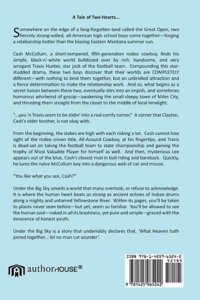 Somewhere on the edge of a long-forgotten land called the Great Open, two fiercely strong-willed, all-American high school boys come together-forging a relationship hotter than the blazing Eastern Montana summer sun. Cash McCollum, a short-tempered, fifth generation rodeo cowboy, finds his simple, black-n'-white world bulldozed over by rich, handsome Travis Hunter, star jock of the football team. And what begins as a secret liaison between them, eventually stirs up into an impish, and sometimes humorous, whirlwind of gossip-awakening the small, sleepy town of Miles City. ".you 'n Travis seem to be slidin' into a real comfy corner." A corner that Cash's older brother, Clayton is not okay with. As time passes, and the friendship deepens, it's their extreme popularity that continues to attract a whole lot of unwanted attention-thrusting them from the closet into the middle of local limelight. From the beginning, the stakes are high with each risking a lot. Cash cannot lose sight of the rodeo crown title, All-Around Cowboy, at his fingertips; and Travis is dead-set on taking the football team to state championship-gaining the trophy of Most Valuable Player for himself as well. Compounding this star-studded drama, these two boys also discover their worlds are COMPLETELY different-with nothing to bind them together but an unbridled attraction and a fierce determination to make the relationship work. "We're comin' from two different cultures-can't you see that? Cash forces Travis to smell the roses. "You obviously come from money. I don't. I never will." It's Travis' persistence, however, that keeps them glued together. ".I can't live without you, Cash, because it's you. who makes me a better guy ." Under the Big Sky unveils a world that many overlook, or refuse to acknowledge. It is where the human heart beats as strong as ancient echoes of Indian drums along a mighty and untamed Yellowstone River. Within its pages, you'll be take